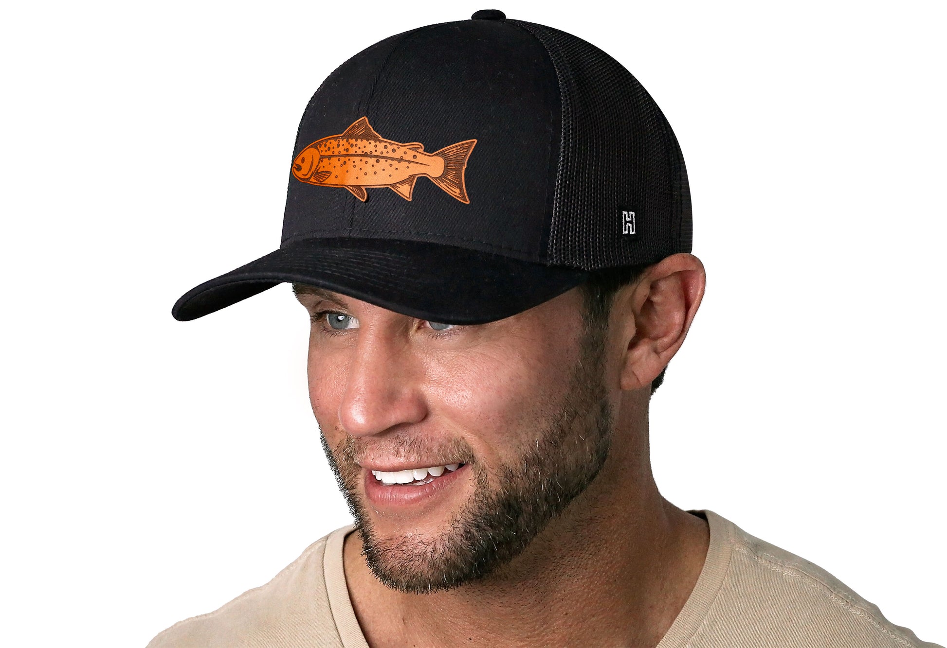 Salmon Trucker Hat Leather | Black Fishing Snapback